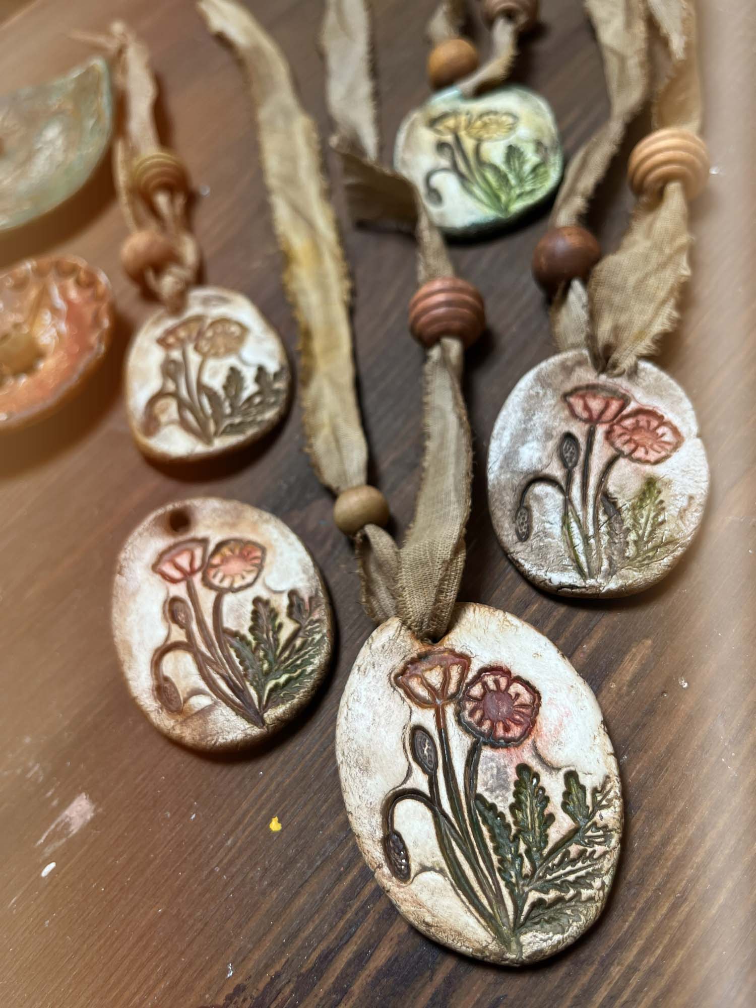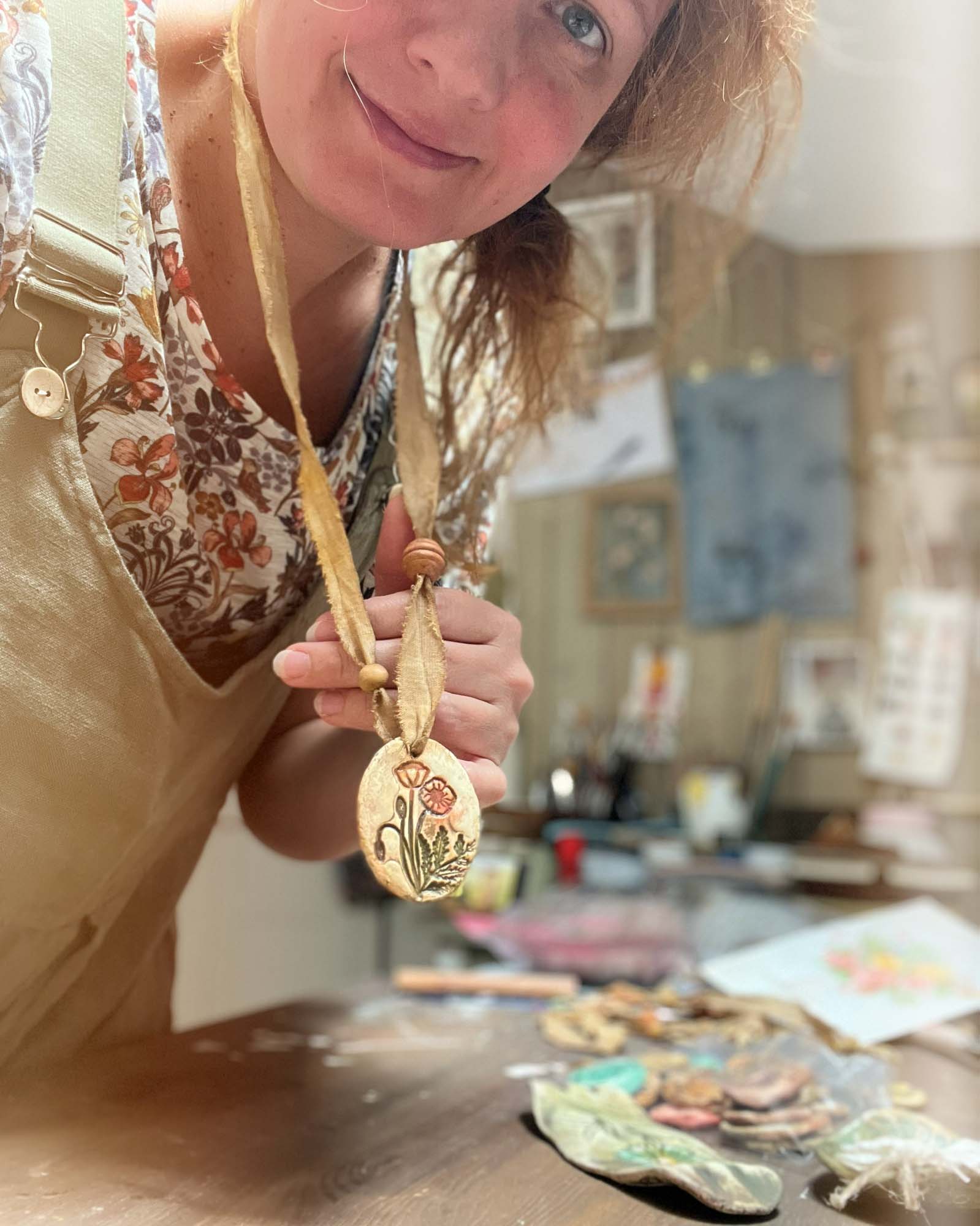 Az ár 1 db pipacs mintájú medálra vonatkozik, lenvászon zsinóron 2 db festett fagolyóval. A festett szín minden egyes darabnál egyedi és megismételhetetlen. Sőt, előre nem igazán tudjuk, milyen is lesz a végeredmény 🙂 Izgalmas! E kedves medál-dísz láttán mosolyogsz, ahányszor ránézel. Én az alkotóműhelyemben minden nap másik medált veszek fel, imádom! Hosszútávon használható észer- dekoráció, örök darab.